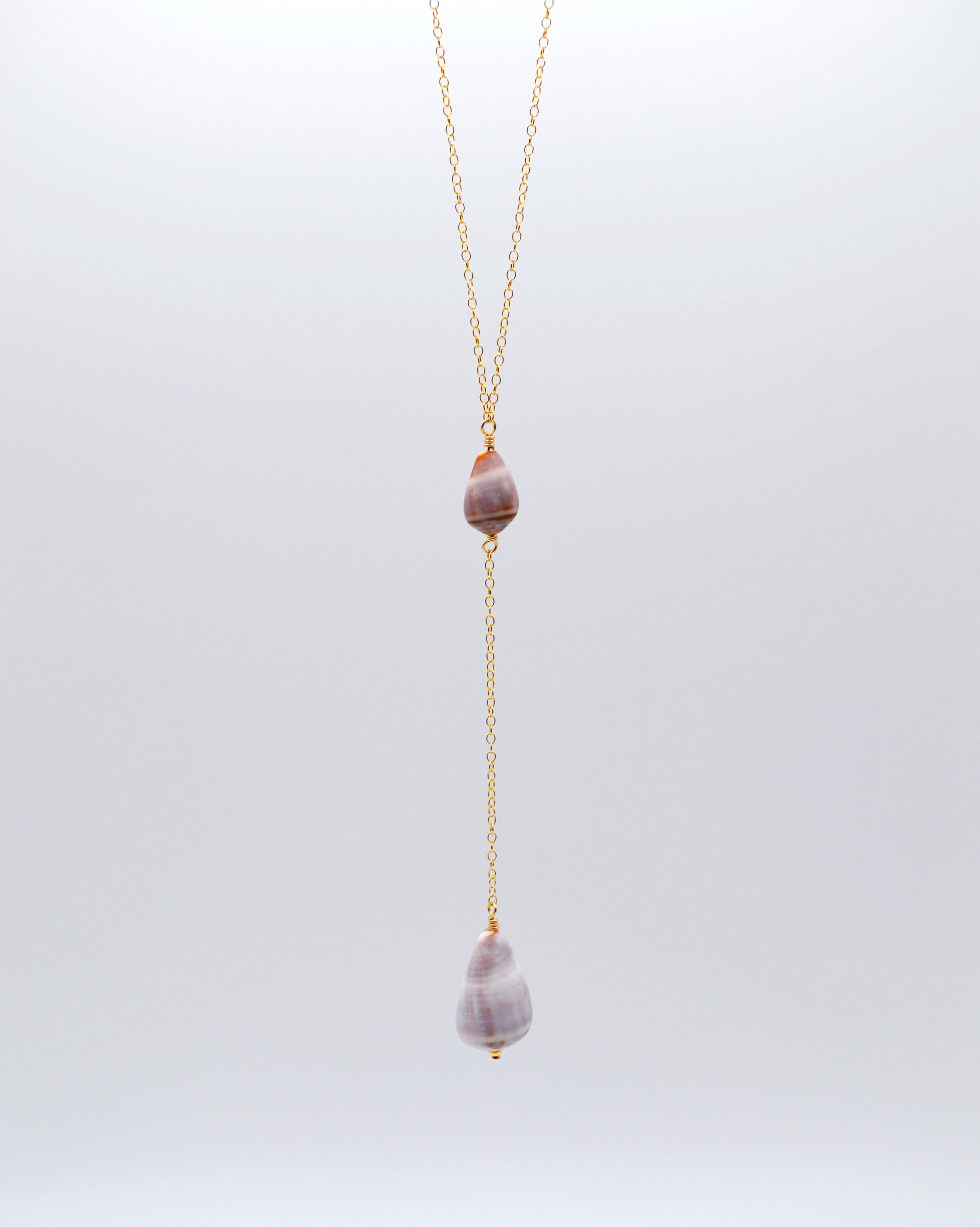 Dainty drop style necklace featuring 2 purple Okinawa cone shells on cable chain