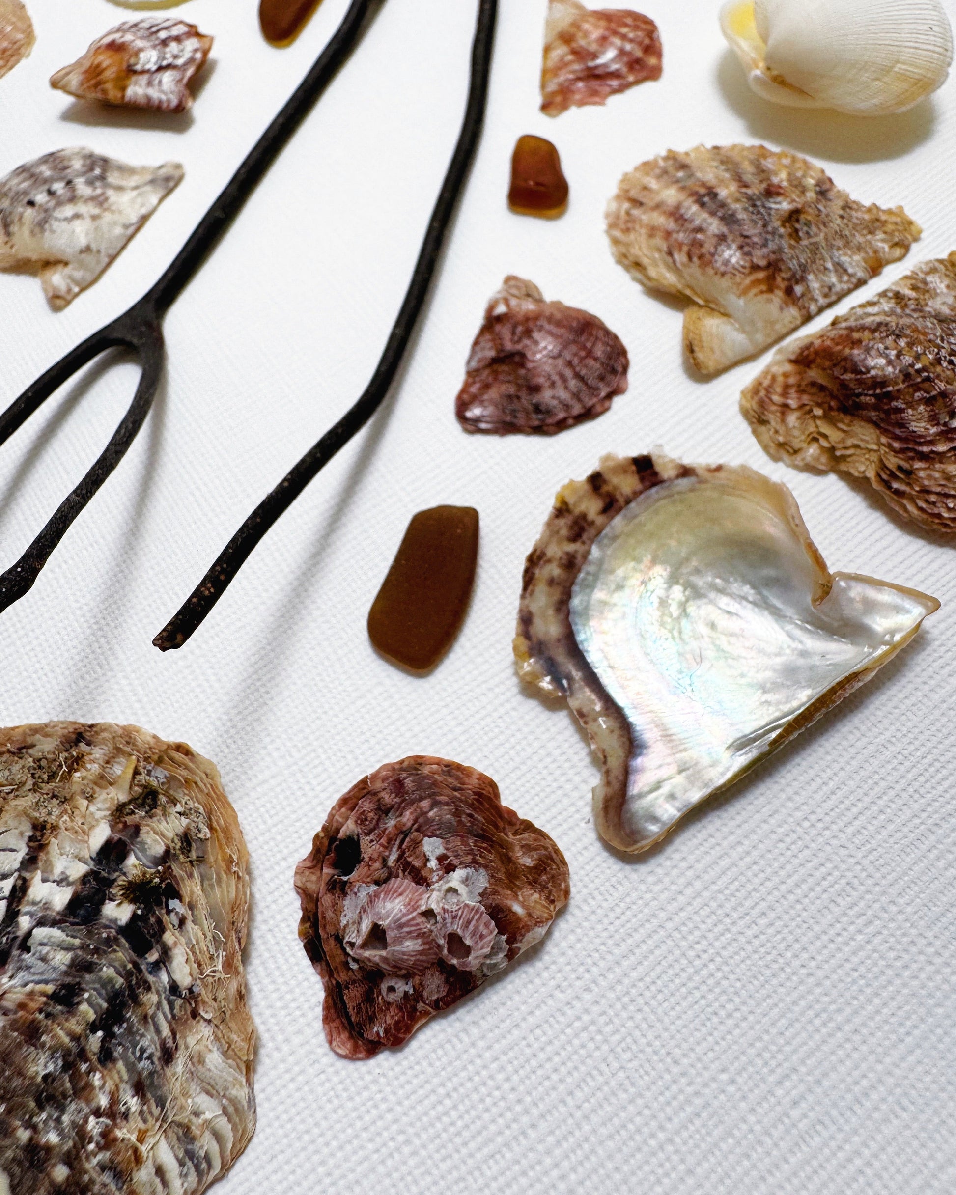 Features iridescent Atlantic pearl oyster shells, buttercup lucines, brown seaglass, and sea fan coral.