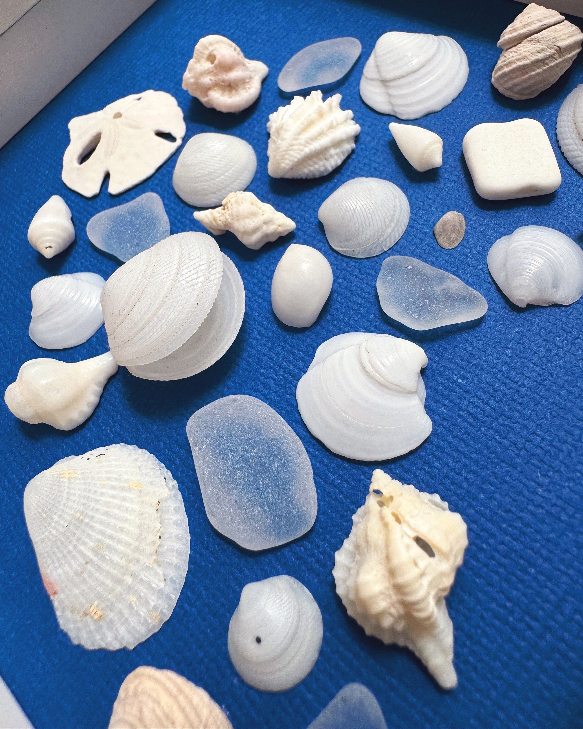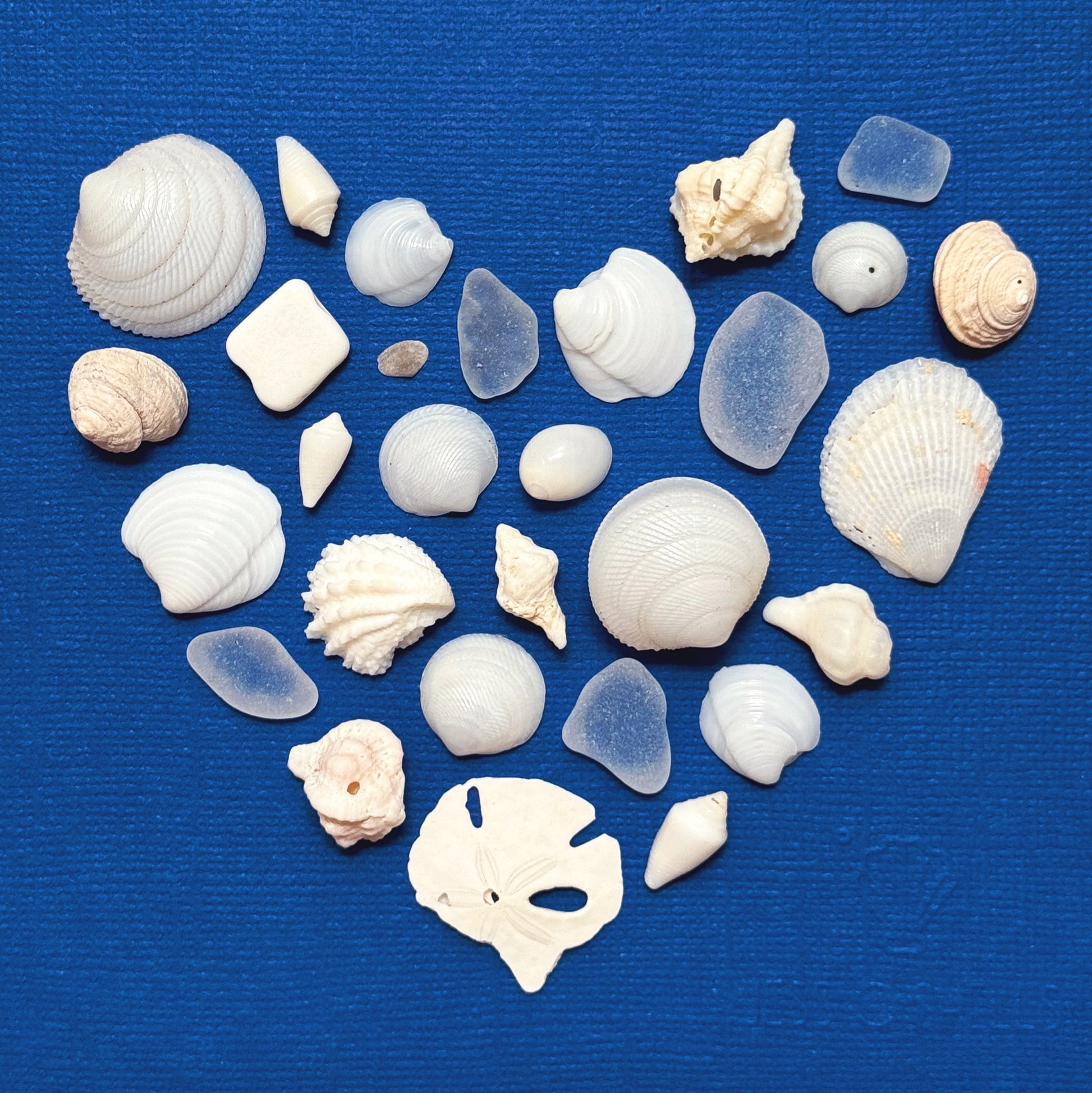 This ocean inspired heart features tiny white shells and a sand dollar from South Florida + seaglass and a teeny tiny piece of sea pottery from Puerto Rico