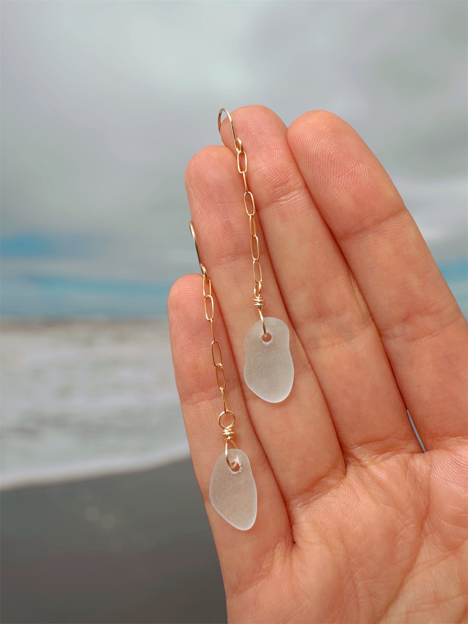 Dangle style earrings featuring pale blue genuine seaglass collected in Puerto Rico on paperclip chain