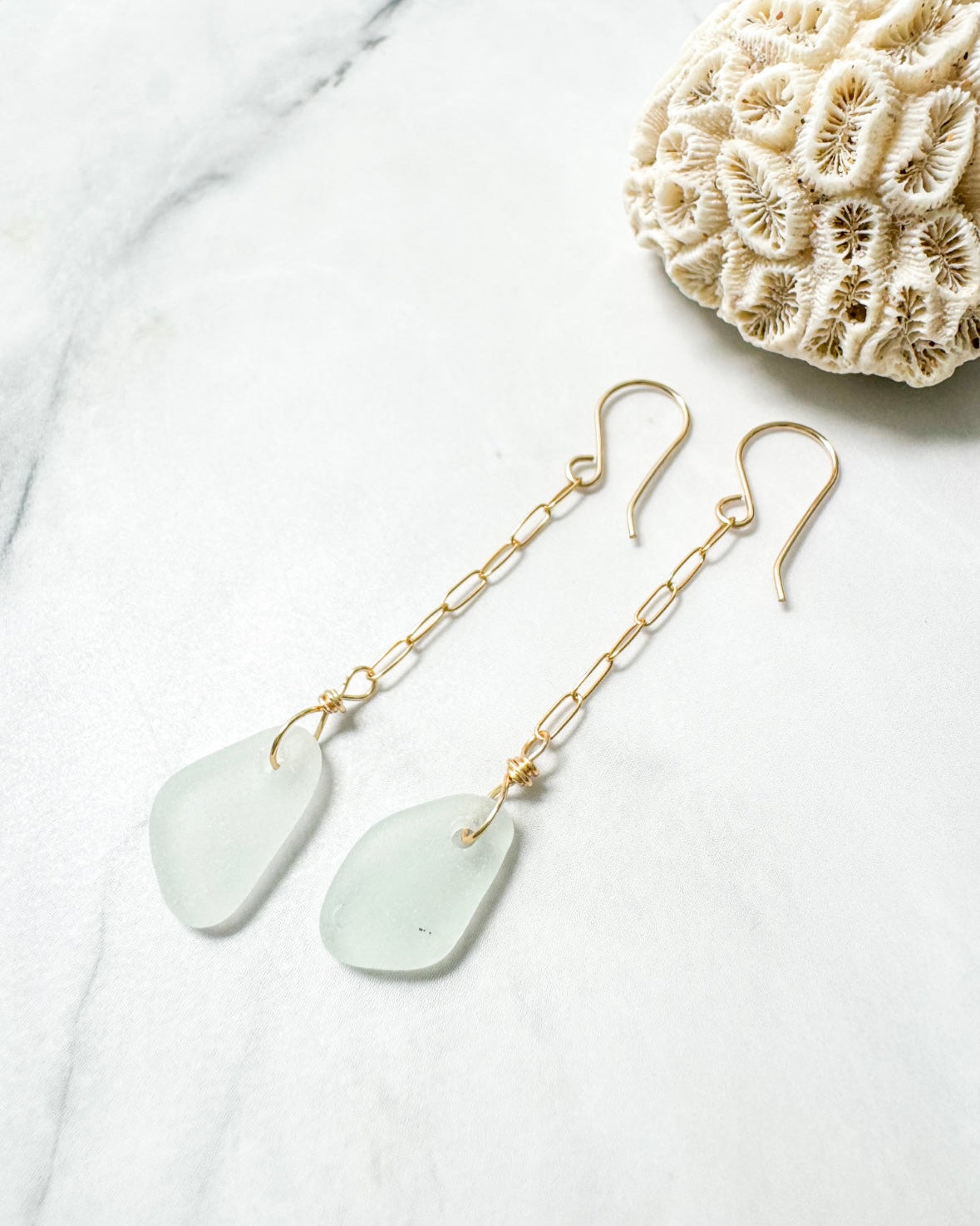 Dangle style earrings featuring pale green genuine seaglass collected in Puerto Rico on paperclip chain