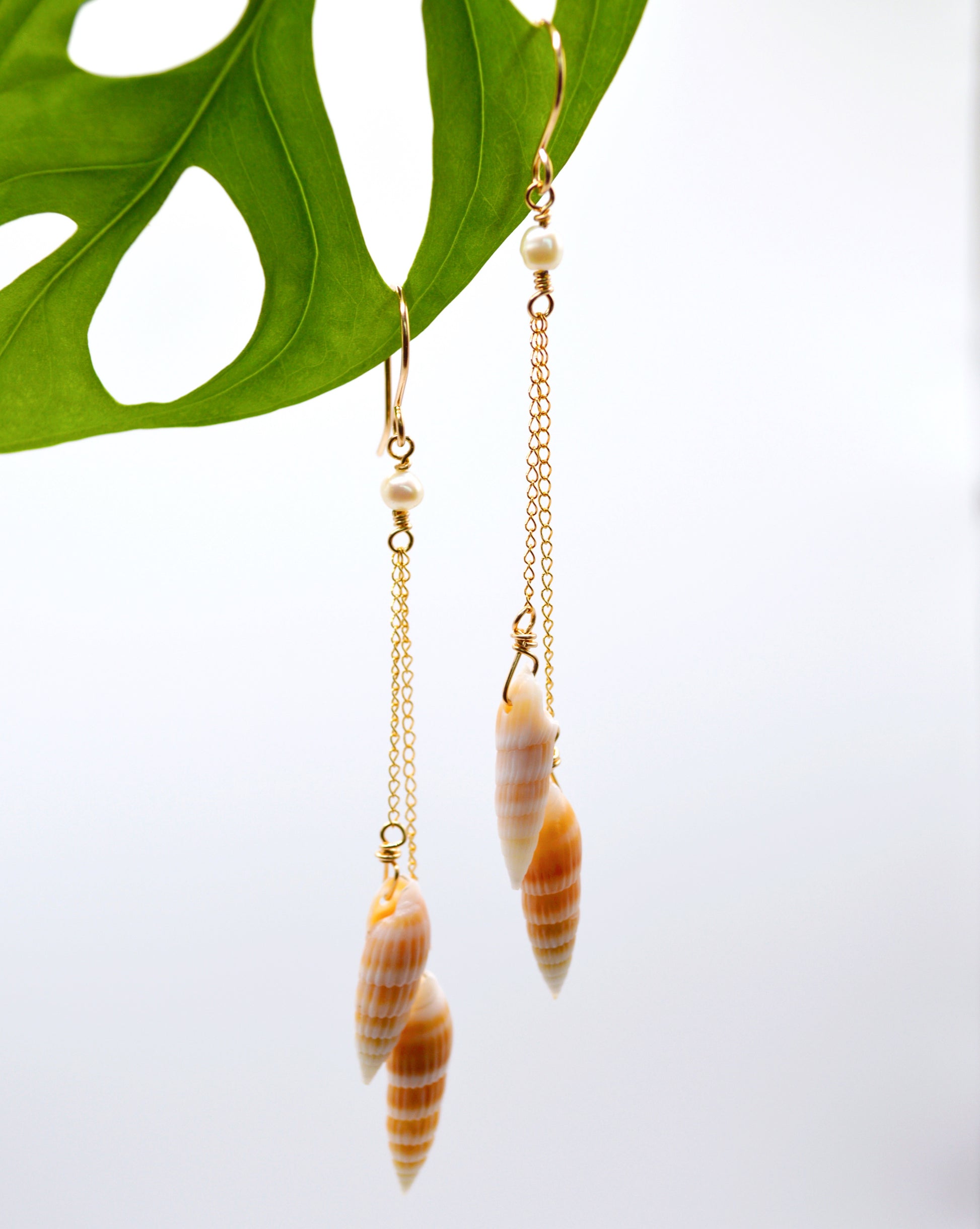 Double dangle style earrings featuring shiny auger shells on cable chain with pearl detail